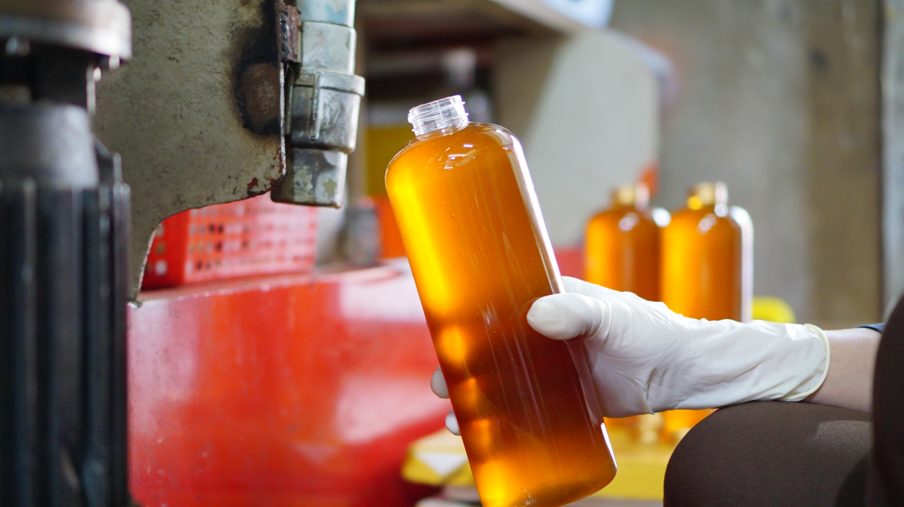 Đóng gói mật ong vào chai nhựa PET an toàn thực phẩm, nhiều dung tích từ 250ml đến 5L.